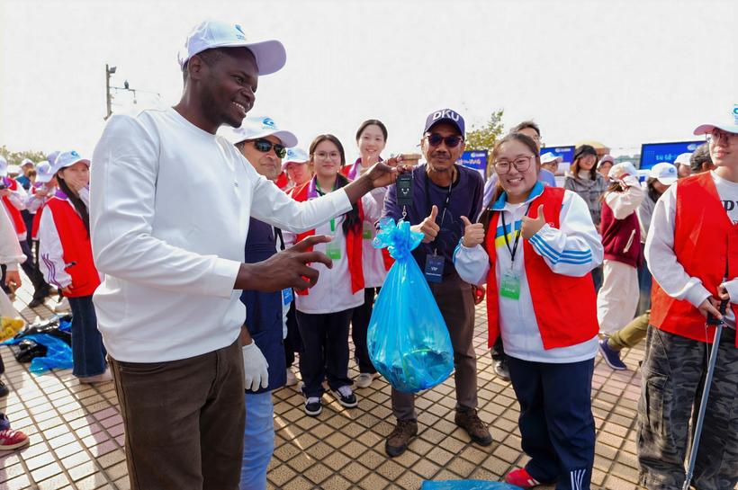 图为国际友人参与杭州、嘉兴的净滩活动
