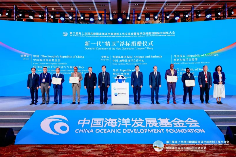 会上,中方代表向安提瓜和巴布达、也门、斐济、马尔代夫赠送新一代“精卫”浮标。